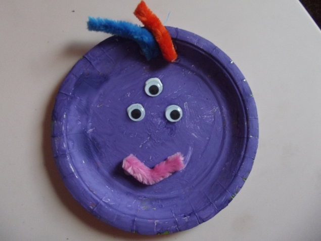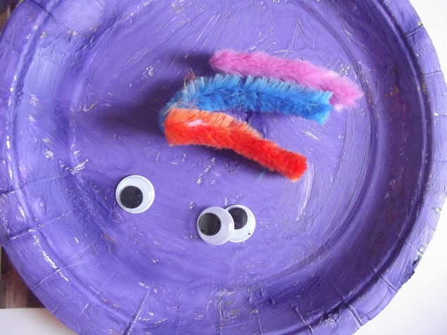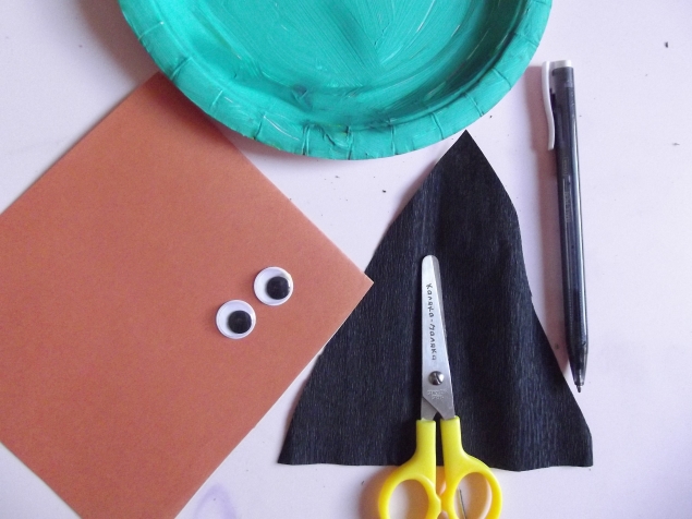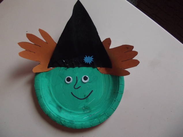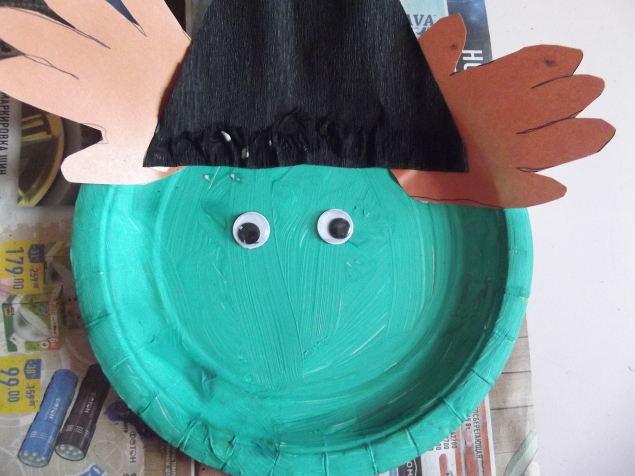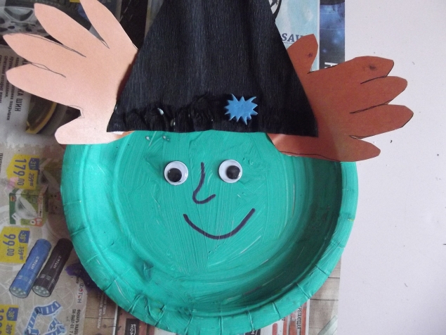 Вырезаем из бумаги отпечатки ладошек - волосы . И шляпу . Приклеиваем глаза или рисуем .