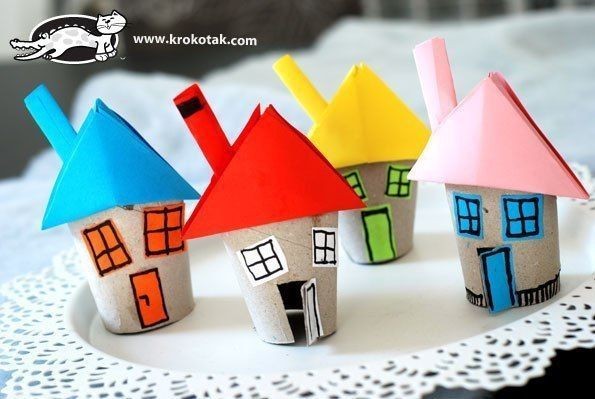 Домики из картонных рулончиков можно сделать с детьми обычными.