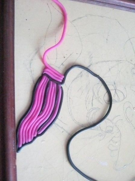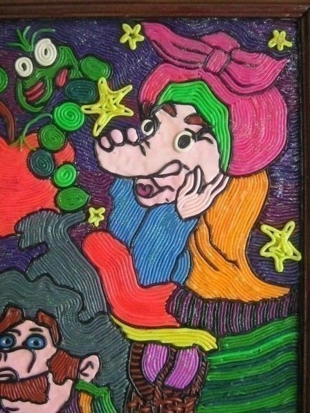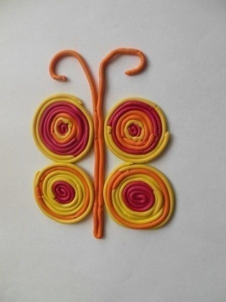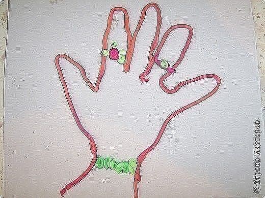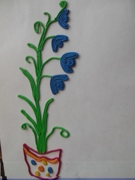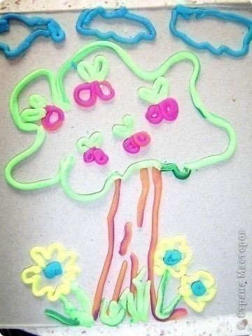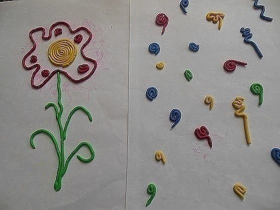 Теперь нам нужно сделать жгутики. Для этого разбираем шприц (вытаскиваем поршень из цилиндра). Из кусочка пластилина делаем "колбаску" и помещаем ее в цилиндр шприца, вставляем поршень на место и немного придавливаем пластилин. То же самое проделываем с пластилином другого цвета. Теперь шприцы с пластилином кладем (горизонтально) в емкость с горячей водой на 2-3 минуты (чтобы пластилин стал мягким). Затем берем шприцы из воды, надавливаем на поршень и выдавливаем жгутики. А теперь работают дети. Раздать детям альбомные листы, можно с контуром рисунка, ребенок жгутиками выкладывает картинку, а можно раздать чистые листы и уже здесь наступает время пофантазировать.