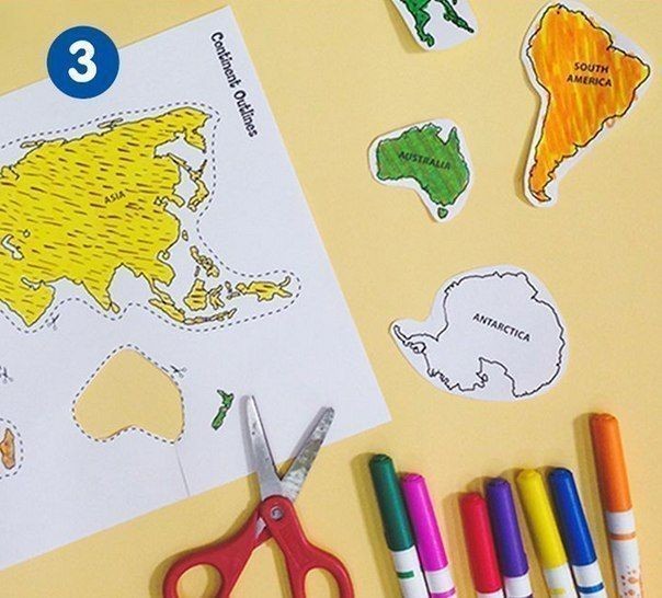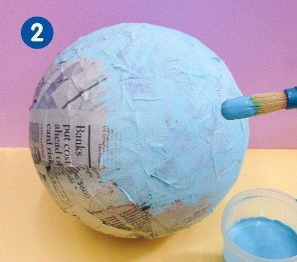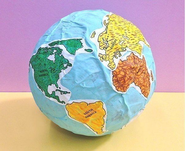 Обклеиваем шарик-мячик газетами или салфетками, красим в голубой цвет и приклеиваем раскрашенные континенты.