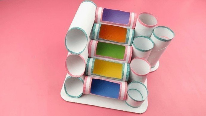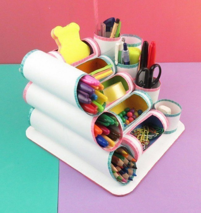 Подставка для канцтоваров из картонных рулонов поможет организовать рабочее пространство ребенка.