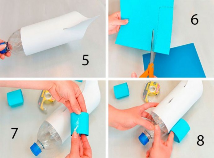 Приклейте 2 заготовки к бутылки, используя двухсторонний скотч, затем прорежьте отверстие для монет.