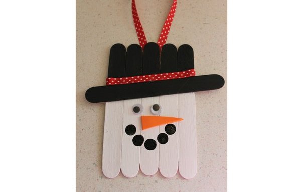Снеговичок из палочек от мороженого. Склеиваем палочки между собой при помощи клея титан, ПВА, момент или можно использовать горячий клей. Предлагаем малышу раскрасить снеговика и приклеить ему нос и глазки.