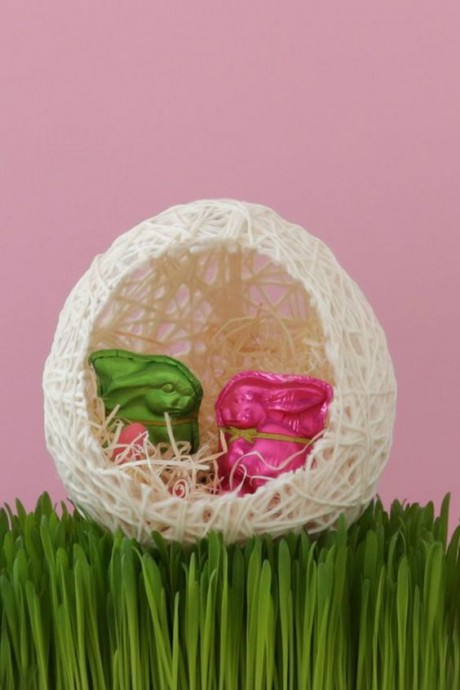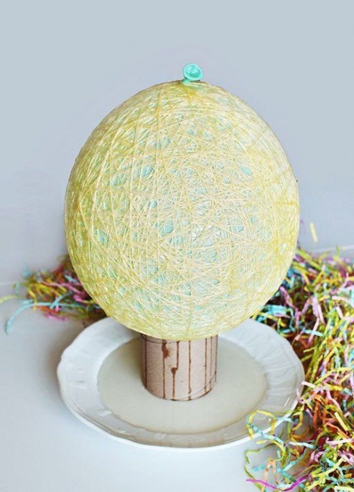 Интересная поделка - пасхальное яйцо из ниток и клея - будет способствовать развитию точности координации детских рук.