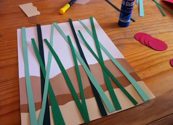 Простая по технике исполнения и законченная по сюжету получается картина из полосок зеленой и овалов красной бумаги.