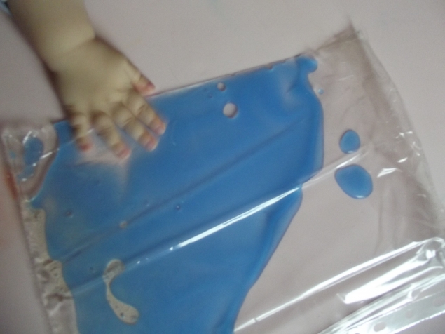 Подкрашиваем полстакана воды красками , добавляем 1 столовую ложку масла . Выливаем смесь в файл . Заклеиваем скотчем . Играем .