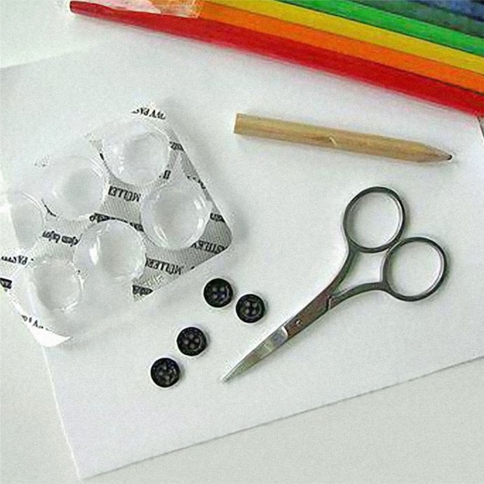 Вырезаем будущие глазки из упаковки для таблеток, оставляя как можно больше плоского пространства рядом с выпуклым.