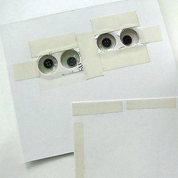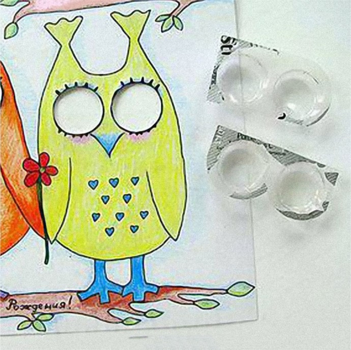 Вырезав дырочки, вставьте глазки из блистера с изнанки поделки выпуклой частью на лицевую сторону. Теперь осталось сделать глаза подвижными. Для этого берём пуговицы, которые смогут свободно двигаться в глазках.