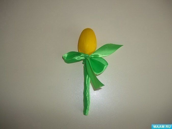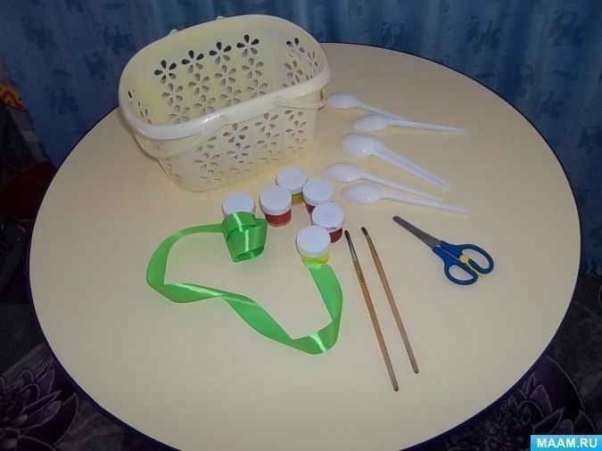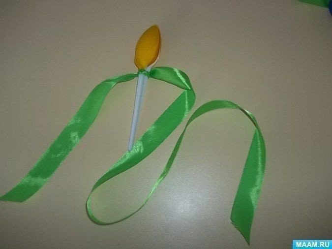 Тюльпаны для любимой мамочки создаются из пластиковых одноразовых ложек и атласных лент.