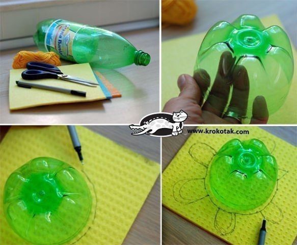 Черепашка из прорезиненной тряпки для стола и донышка пластиковой бутылки на редкость хорошо выглядит и двигается в умелых руках ребенка.