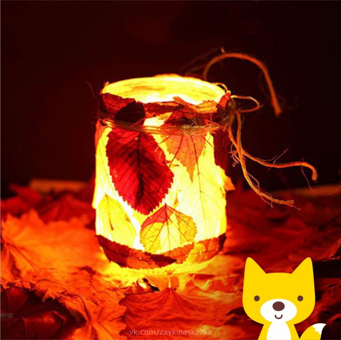 Если яркими разноцветными листьями обклеить стеклянную баночку, а внутрь поместить свечу, то получится замечательный чудесный фонарик.