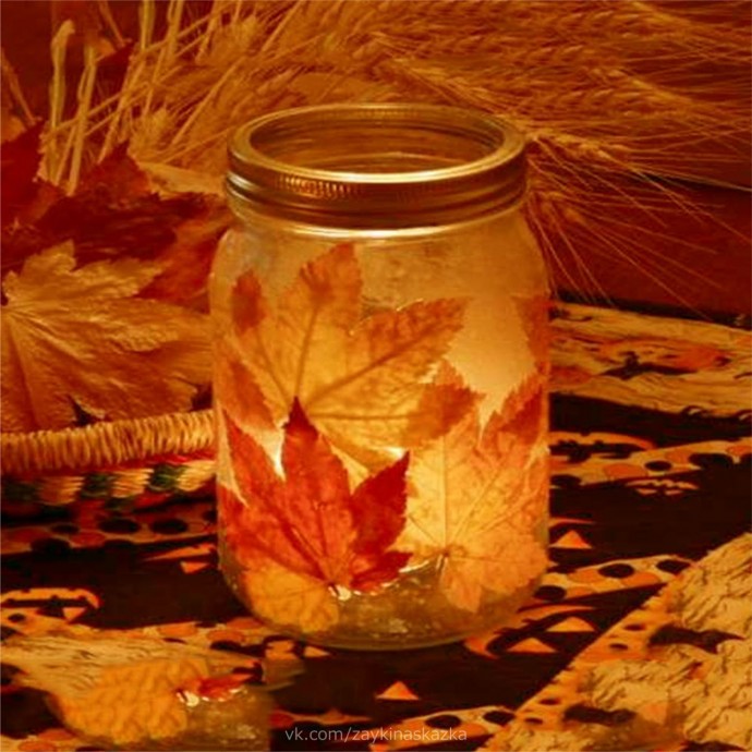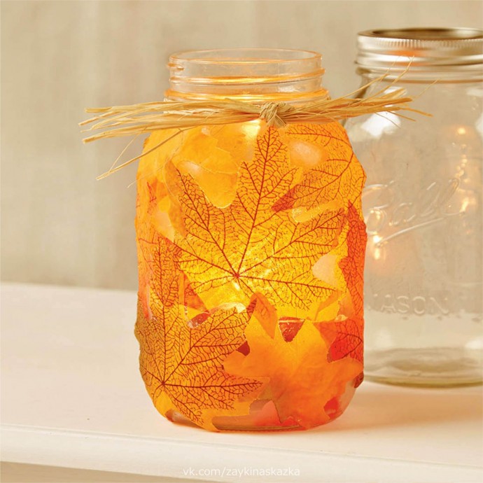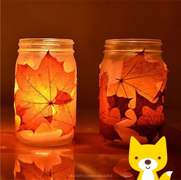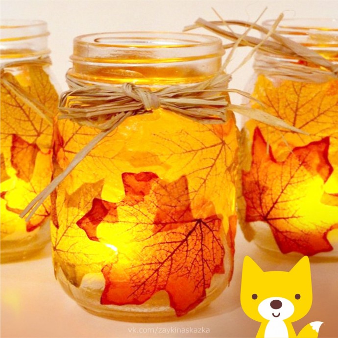 Осенние фонарики из стеклянных баночек и листьев