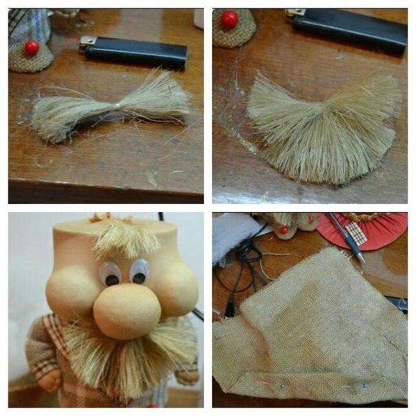 18. Берем 2 пучка пакли. Стягиваем ниткой. Один вверху, который поменьше, и посередине, который побольше.
