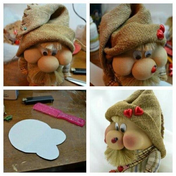 12.Носик приклеиваем, щечки закладываем за колготку и вяжем узел теперь наверху.