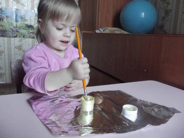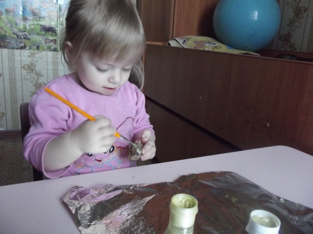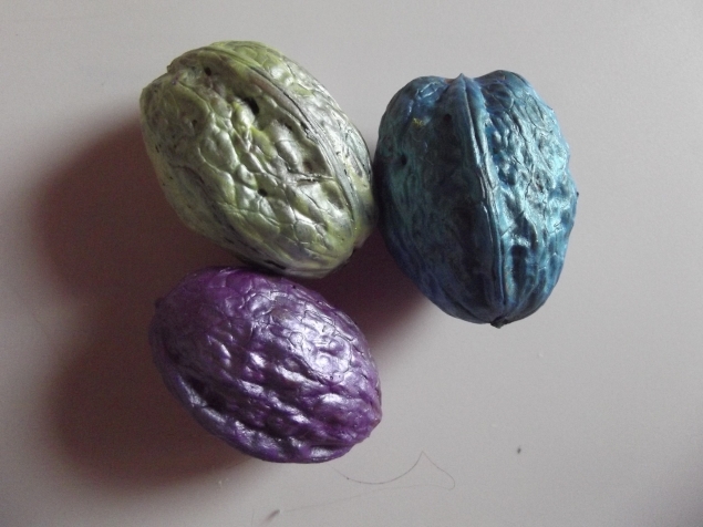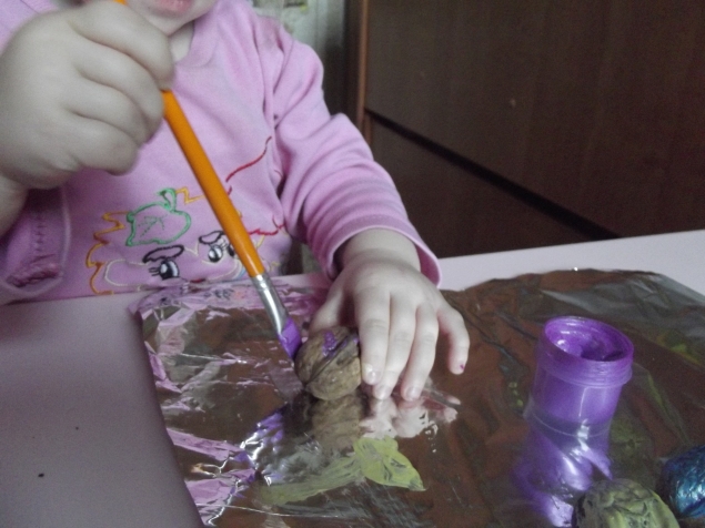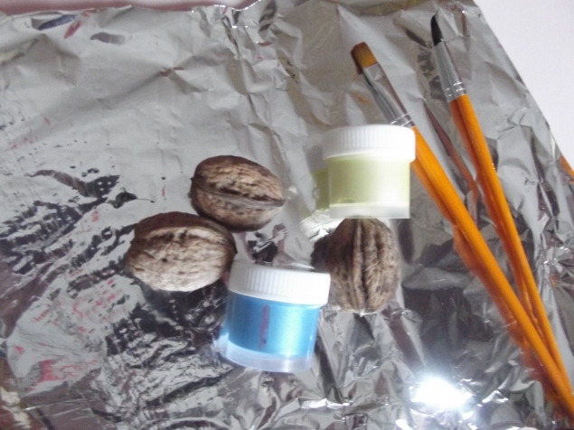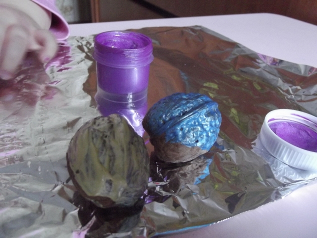 Красить лучше гуашью или акриловой краской . Если используете гуашь , добавьте в нее немного клея ПВА , так она будет долговечнее . Сверху можно покрыть блестками .