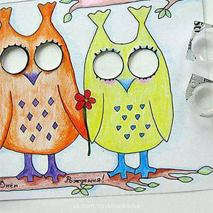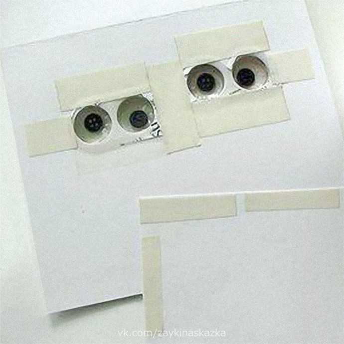 Вырезав дырочки, вставьте глазки из блистера с изнанки поделки выпуклой частью на лицевую сторону. Теперь осталось сделать глаза подвижными. Для этого берём пуговицы, которые смогут свободно двигаться в глазках.