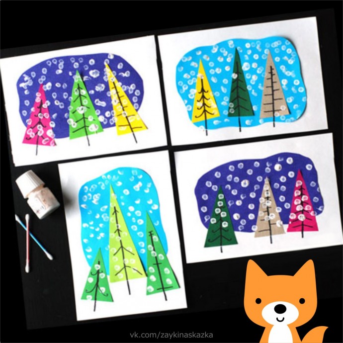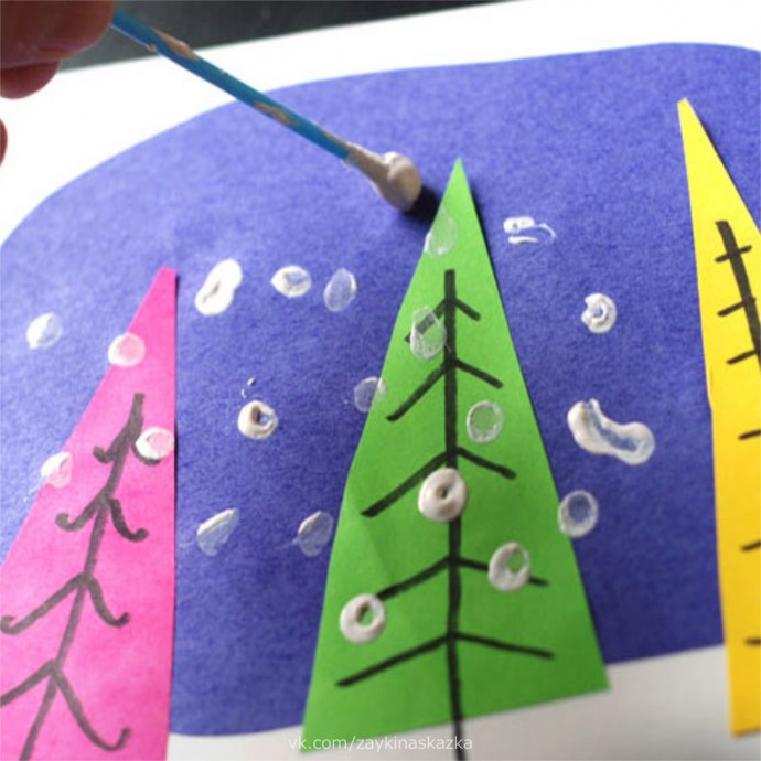 Аппликация из цветной бумаги в виде зимнего леса положительно скажется на развитии ребенка.