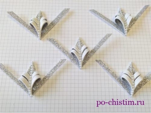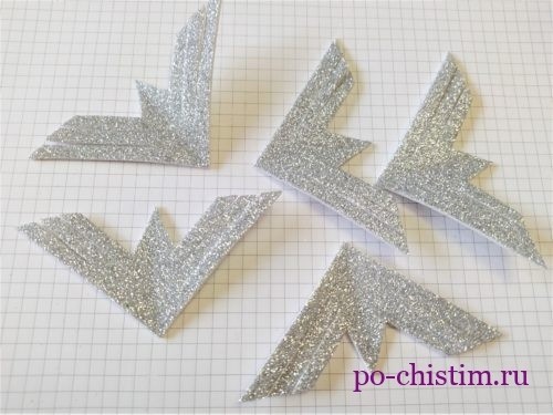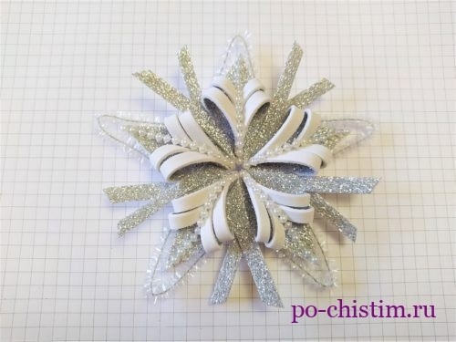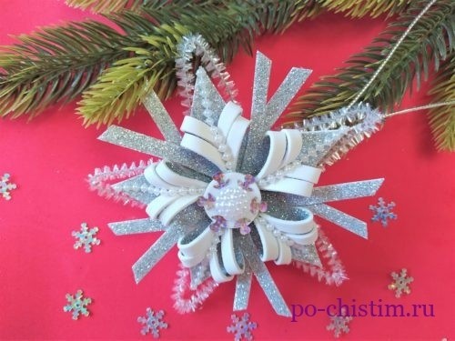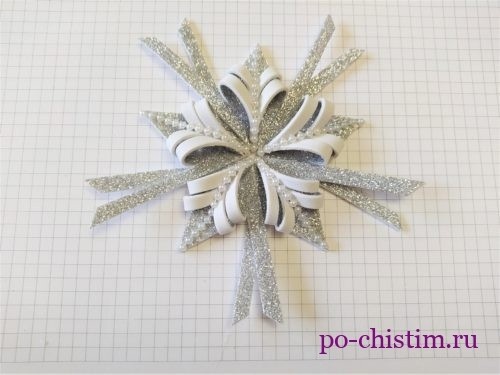 Снежинки из фоамирана уже давно составляют конкуренцию бумажным поделкам. Выполнять их так же легко, но смотрятся они просто сказочно, ведь можно использовать глиттерный фоамиран – лучшего новогоднего варианта не найти.