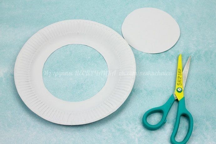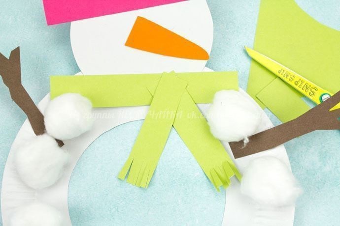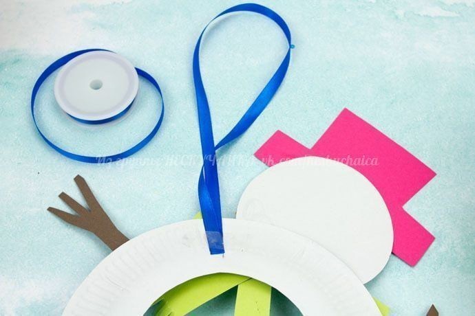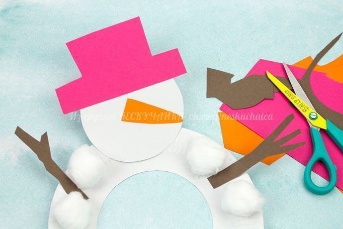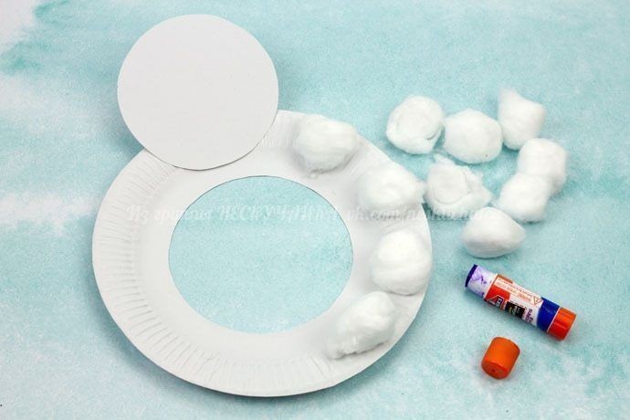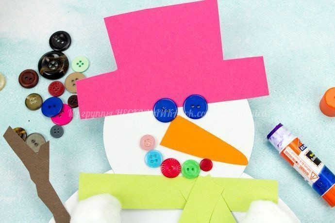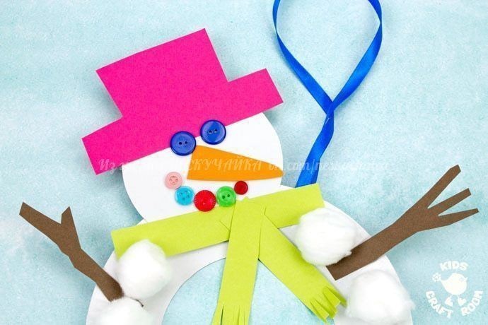 Снеговик-подвеска делается из одноразовой картонной тарелки и остатков пуговиц.