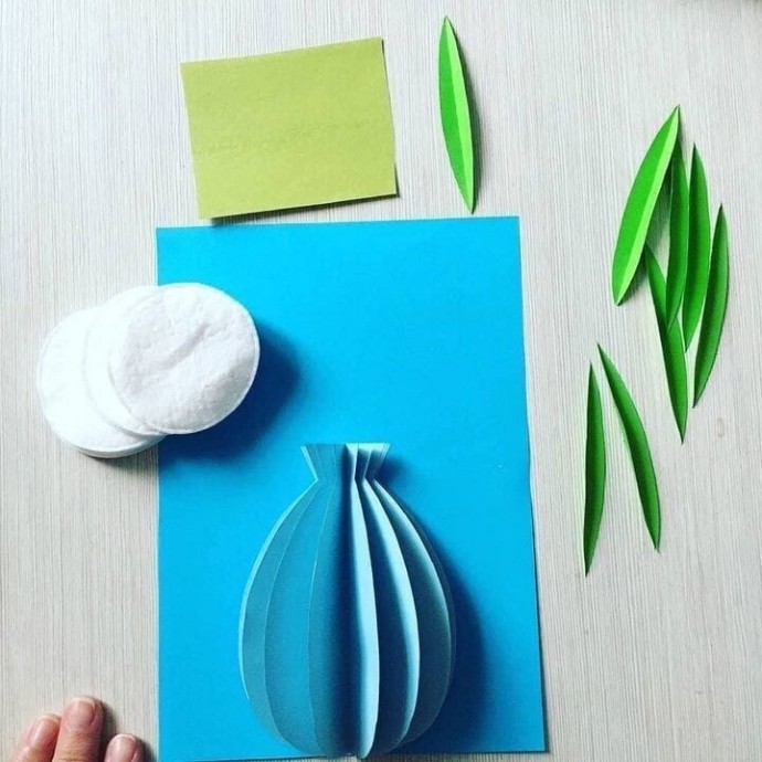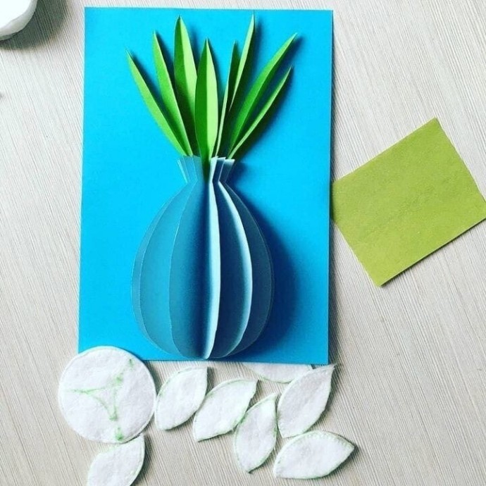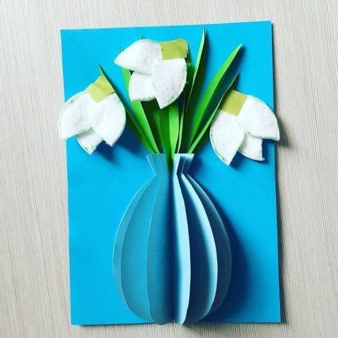 Подснежники в вазе делаются из цветной бумаги и ватных дисков.