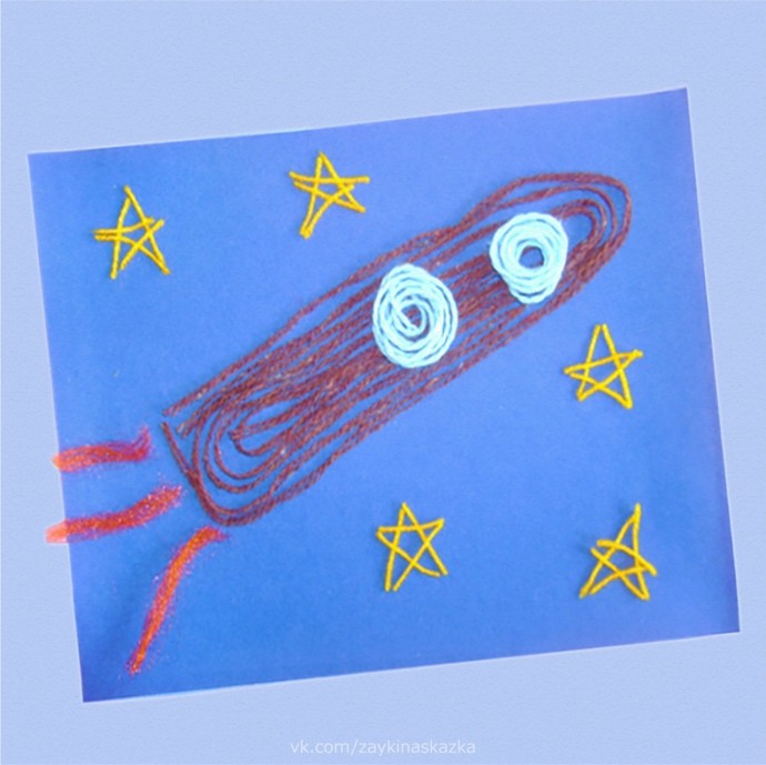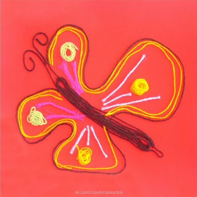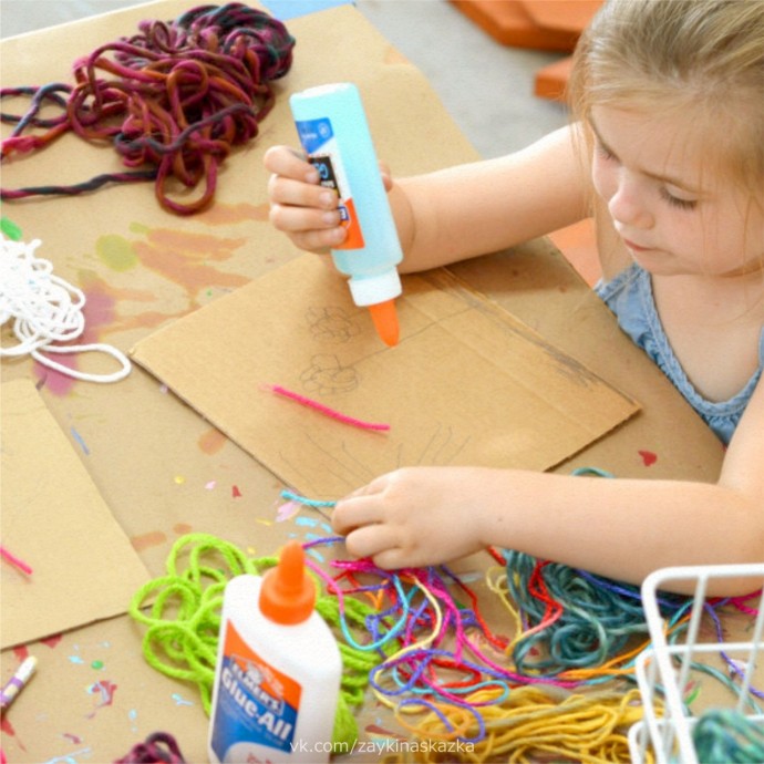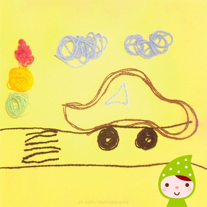 «Рисунки», выполненные толстой нитью или шнуром, отличаются мягкостью получаемых форм, кажутся объёмными и «живыми» по сравнению с обычным контурным изображением. Кроме того занятия с податливой, мягкой и пушистой нитью успокаивают детей и развивают у них интерес к творчеству.