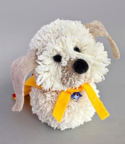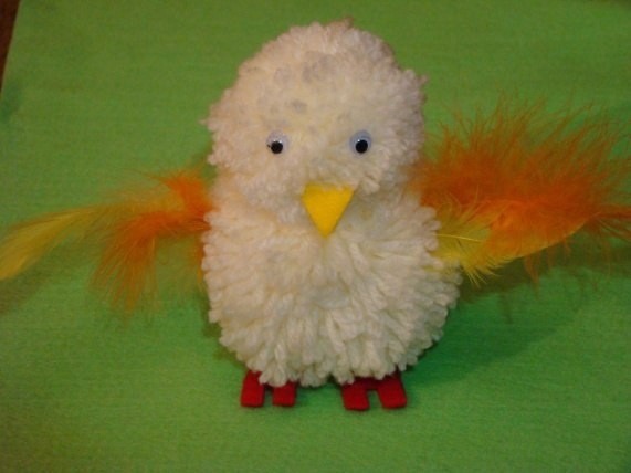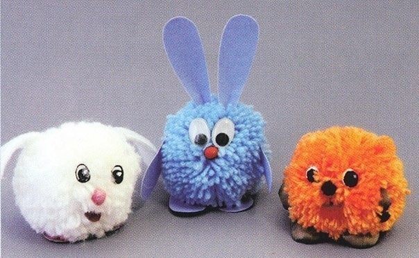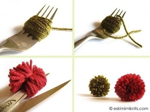 Затем между двумя кружками осторожно проводится нить и несколько раз туго обматывается вокруг ниток, которыми обматывались кружки. Нить закрепляется узлом очень туго. Снимаем аккуратно кружки с помпона (их можно использовать еще 1 раз), если не получается — можно разрезать их ножницами.