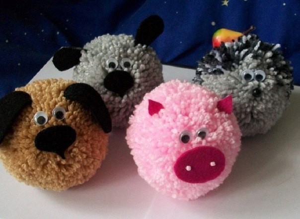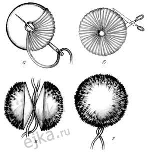 Чтобы сделать такой помпон своими руками нам потребуется 2 кружочка из плотного картона с отверстием посередине. складываем их вместе и плотно обматываем нитками. Можно делать не так как показано на рисунке — без использования иголки. Смотайте из ниток небольшой клубок и обматывайте кружки, протягивая этот клубок в отверстие, так будет быстрее.
