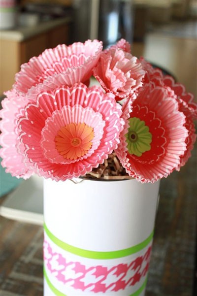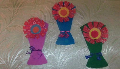 Прикладываем на цветной картон трафарет букета и вырезаем его ножницами. Цвет картона – любой, какой понравится. Обклеиваем вырезанный трафарет гофрированной бумагой. Берем формочки для выпечки кексов и надрезаем их по всей окружности на множество полосок. Получаются цветочки с лепестками. Клеим в середину цветка кружочек, вырезанный из цветной бумаги. Все, цветок получается совсем как настоящий. Приклеиваем готовый цветок к верхушке вырезанного из трафарета букета. Повязываем букет ленточкой серпантина. Или – ставим его в вазочку. Все, теперь букет полностью готов, и его можно дарить маме.