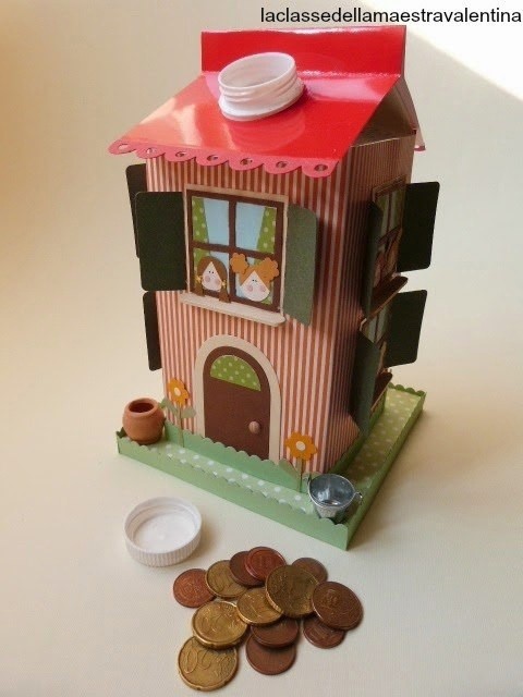 В отверстие от пробки в тетрапаке из-под молока, например, прекрасно входят мелкие монетки. Поэтому тетрапак можно превратить в большую надежную копилку. Надежную - потому что обратно выходят нелегко. Копилку можно наполнять мелочью не один месяц, а затем просто разрезать дно. И, конечно, украсить ее лучше основательно, чтобы приятно было смотреть. Самая простая идея - превратить тетрапак-копилку в домик. Просто вырежьте из цветной бумаги и картона детали - окна, двери, лица жильцов, цветочки для подоконников - и приклейте их по всем сторонам. Тетрапак хорошо промойте перед использованием.