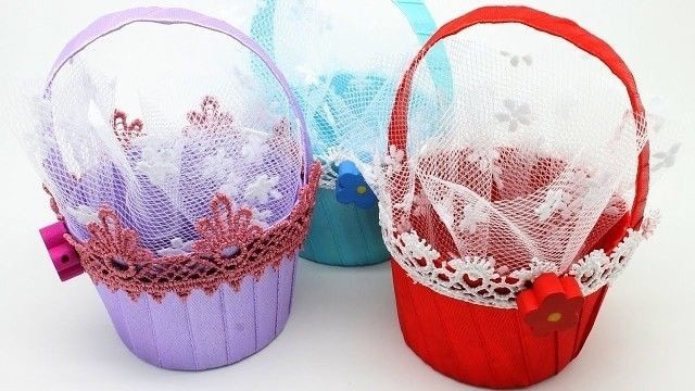 Для создания такой корзиночки нужно оплести с детьми атласными лентами пластиковую ёмкость, предварительно отделив дно.