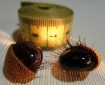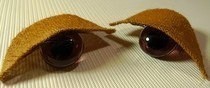 Если Вы делаете веки из натуральной кожи, например, лайковой, кусочки кожи, вырезанные по выкройке, можно немного подогреть, например, на сковороде. Тогда кожа будет очень податлива и отлично натянется на глаз при приклеивании.Чтобы придать ресницам изгиб, после того как клей полностью высох, ресницы можно подвить с помощью специального инструмента для завивки женских ресниц.