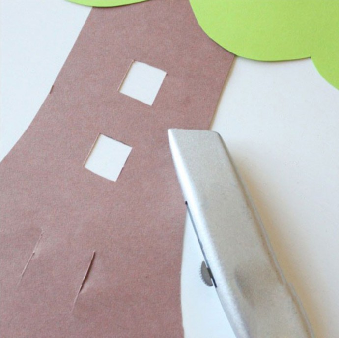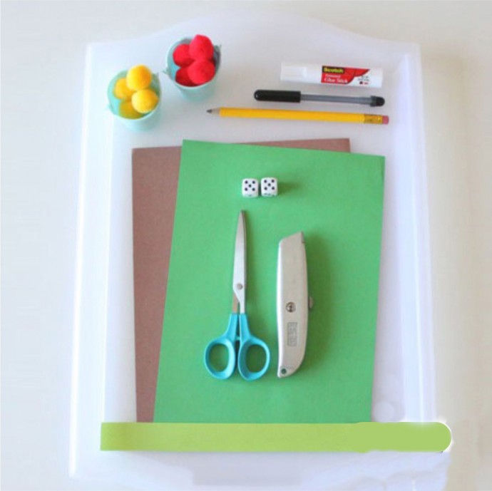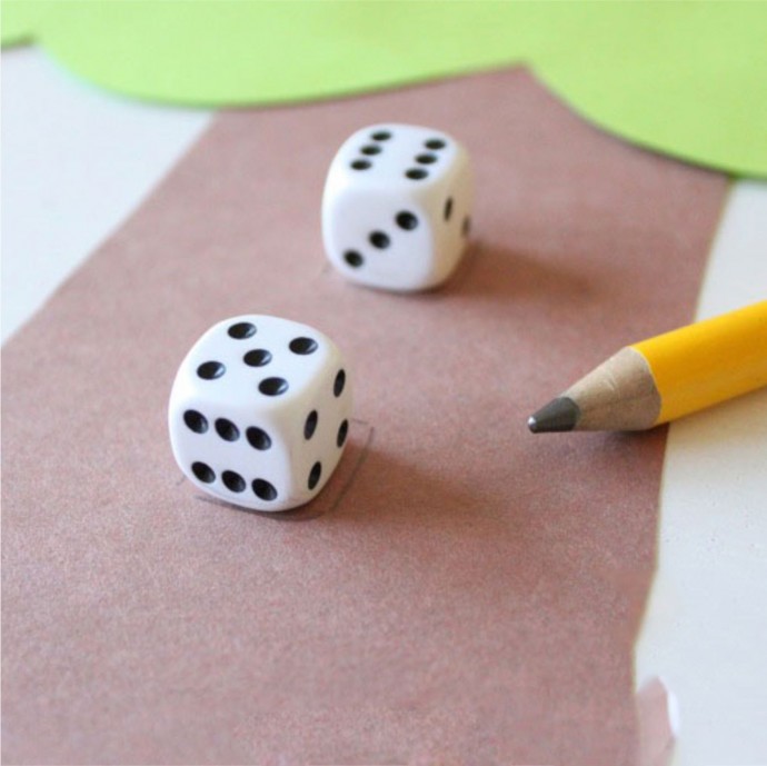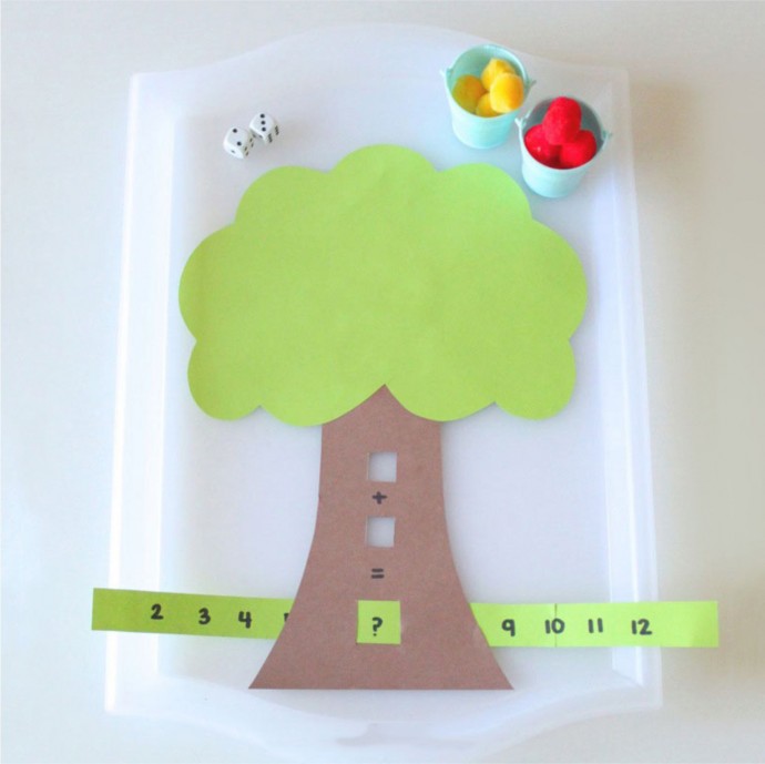 Установите линейку так, чтобы в окошечке находился знак вопроса. Предложите ребенку бросить первый кубик и разместить на кроне «яблоки» красного цвета по числу точек. Затем попросите бросить второй кубик и разложить желтые «яблоки». Разместите кубики в отверстиях ствола и спросите, сколько всего получилось яблок. Пусть ребенок сдвинет линейку так, чтобы в окошечке появился ответ.