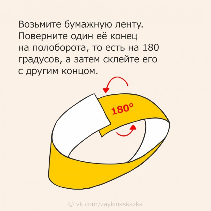 Немецкий астроном и математик Август Фердинанд Мёбиус взял однажды бумажную ленту, повернул один ее конец на полоборота (то есть на 180 градусов), а потом склеил его с другим концом. То ли от скуки он это сделал, то ли научного интереса ради — теперь уже неизвестно. Зато доподлинно известно, что именно так и появилась еще в прошлом веке знаменитая лента Мёбиуса. Чем же она знаменита? А тем, что поверхность ленты Мёбиуса имеет только одну сторону. Это легко проверить. Возьмите карандаш и начните закрашивать ленту в каком-нибудь направлении. Вскоре вы вернетесь в то место, откуда начали. А теперь поглядите внимательно: закрашенной оказалась вся лента целиком! А ведь вы ее не переворачивали, чтобы закрасить с другой стороны. Да и не смогли бы перевернуть, даже если бы очень захотели. Потому как поверхность ленты Мёбиуса — односторонняя. Такое вот у нее любопытное свойство наблюдается.