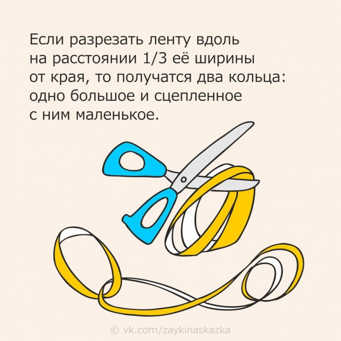 Что же из этого свойства следует? Следуют удивительные превращения ленты, если разрезать ее вдоль. Точно посередине — вы уже пробовали. А вот если разрезать ленту на расстоянии 1/3 ее ширины от края, то получаются два кольца — но! — одно большое и сцепленное с ним маленькое. Если же разрезать еще и маленькое кольцо вдоль посередине, то у вас окажется весьма «затейливое» переплетение двух колец — одинаковых по размеру, но разных по ширине. Чудеса? Попробуйте сами!