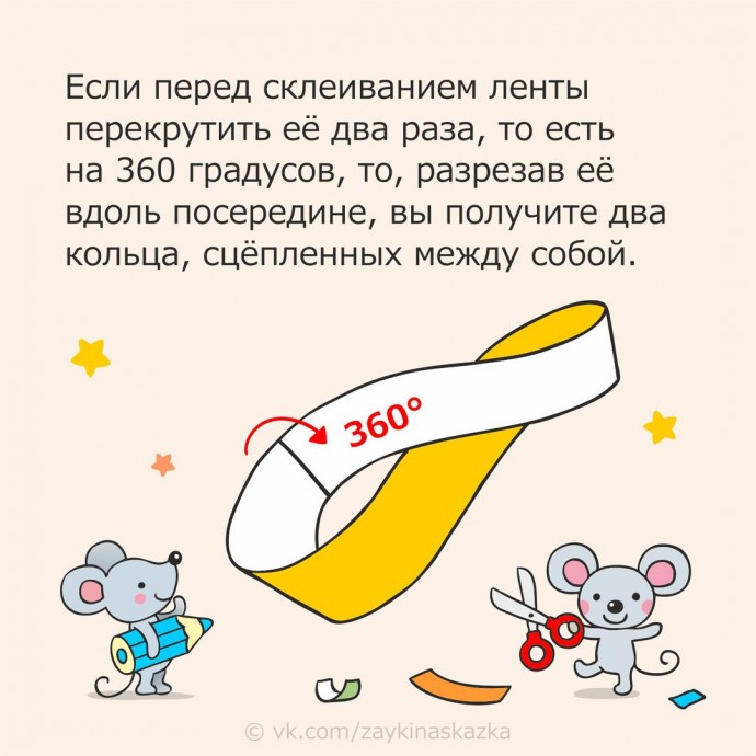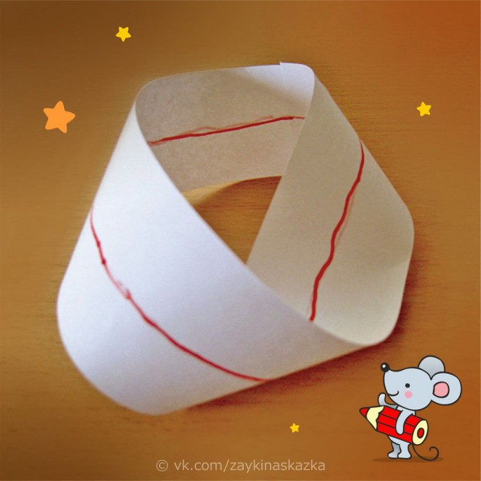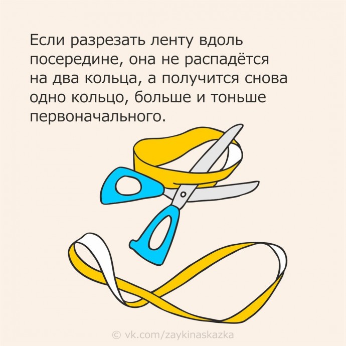 В одной руке у вас ножницы. В другой большое кольцо, склеенное из длинной бумажной ленты. Ножницы протыкают эту ленту и аккуратно разрезают ее вдоль — точно посередине. «Ну вот, — подумаете вы, — сейчас получатся два отдельных кольца. Еще последний «вжик» — и…» Но что это? Вместо двух колец получается одно! Причем оно больше и тоньше первоначального. «Такого не бывает», — скажете вы. Бывает. И даже еще не такое. Если только в руках у вас не обычное бумажное кольцо, а удивительная лента Мёбиуса.