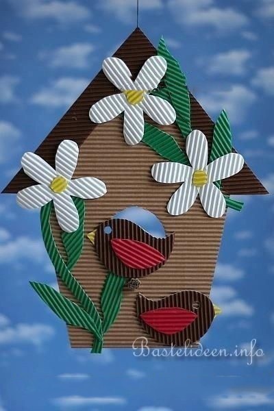 Скворечник из гофрированного картона дополнительно для красоты декорирован цветами.