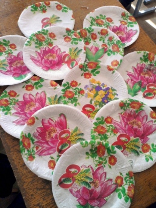 Отрезают лишние края, оставляя от края тарелки примерно 1 см салфетки. Переворачивают тарелку, промазывают ее края жидким клеем и загибают оставленные края салфетки.