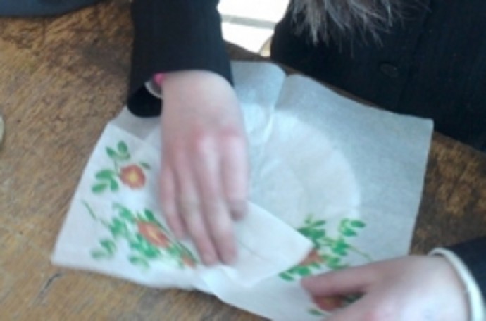 Первым делом промазывают тарелку клеем и располагают на ней салфетку с рисунком.