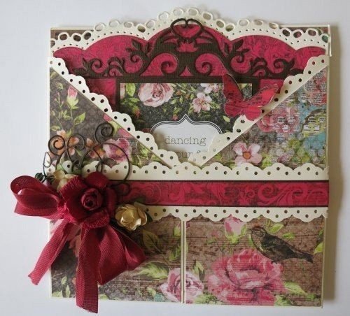 Открытка с бантом и цветами выполняется с использованием ажурных бумажных салфеток.