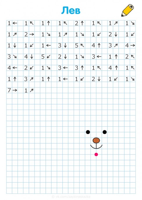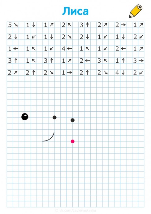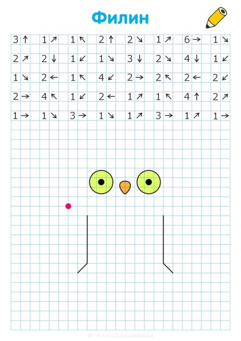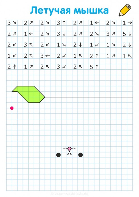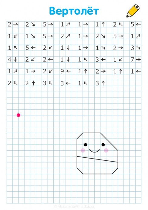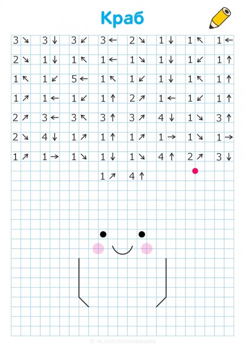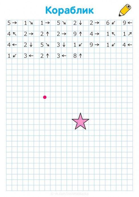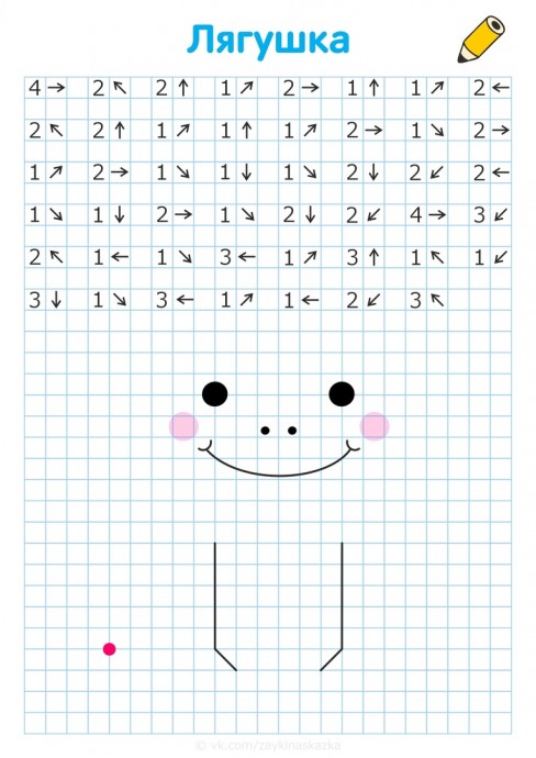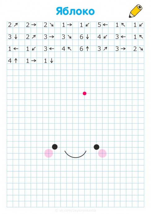 Распечатайте шаблоны и предложите ребёнку рисовать по клеточкам, как подсказывают цифры и стрелки. Цифра обозначает количество клеток, а стрелка — направление движения ручки. Начинать рисовать следует от красной точки.