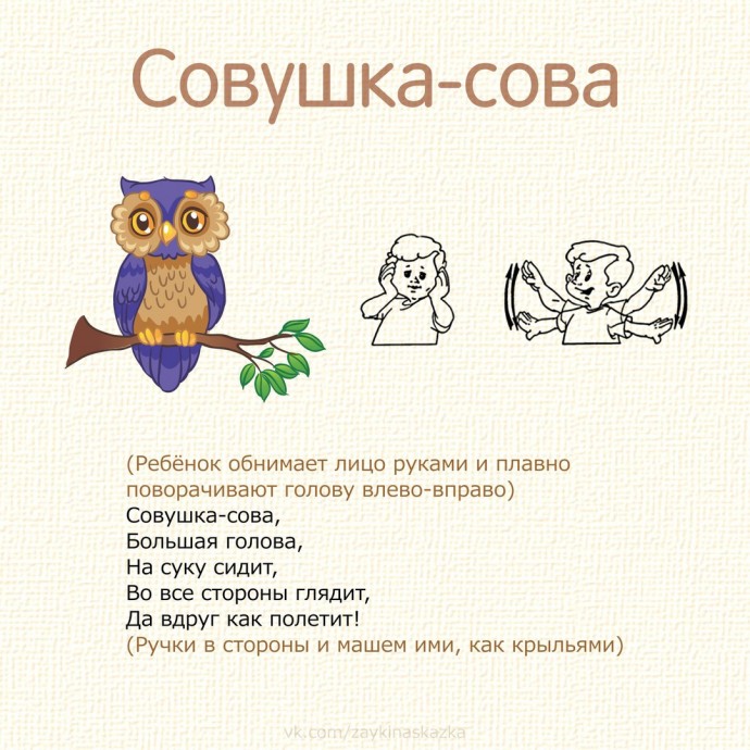 Совушка-сова, Большая голова, На суку сидит, Во все стороны глядит, Да вдруг как полетит! (ручки в стороны и машем ими, как крыльями)