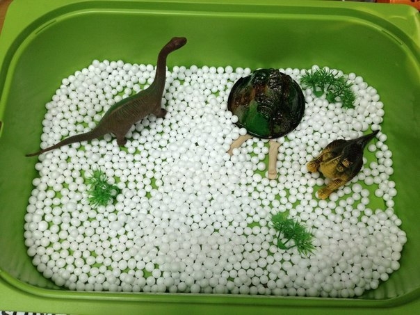 Орудия: маленькие совки, грабли и лопатки, чашки, воронки, сита, пинцеты. Вероятнее всего, первое знакомство малыша сведется к пересыпанию и перекладыванию материалов. Но уже для годовалых малышей можно вводить в оборот небольшие фигурки героев. Малышам нравится закапывать и находить маленькие игрушки. Можно спрятать в сыпучем материале 10-12 игрушек и предложить ребенку найти их.