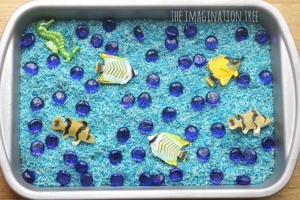 После первого знакомства с материалом, можно предлагать ребенку задания: пересыпать из одной чашки в другую, подобрать соразмерное орудие для вычерпывания воды из бассейна, распределить сухопутных и живущих в воде персонажей в соответствующую среду и т.п.