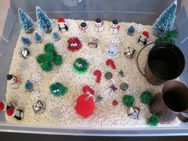 Годовалым малышам уже можно предлагать коробки с сыпучими наполнителями, но лучше сделать их из съедобных материалов. В качестве контейнера подойдет пластиковый бокс с крышкой (например, длиной 40 см, шириной 28 см и глубиной 15 см).