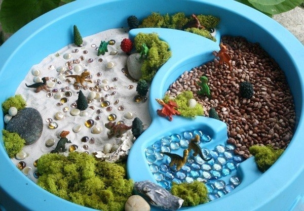 Коробку можно наполнить песком и поставить в центр небольшую емкость с водой для игры в пляж. Ребенок уже готов поиграть с несколькими персонажами, вообразить их плавающими в бассейне, загорающими или читающими в тени деревьев. Так что у мамы появляется возможность поиграть в ландшафтного дизайнера, сделать из мокрого песка горку, вкопать по углам крошечные кадки с растениями – искусственными или настоящими, выбрать подходящих персонажей из детской коробки с игрушками. Но переполнять пространство реквизитом не стоит, так как малышу все еще нравится просто пересыпать песок, возможно, сделать в бассейне «кашу-малашу» и проделать другие вещи, не следующие определенному игровому сюжету.
