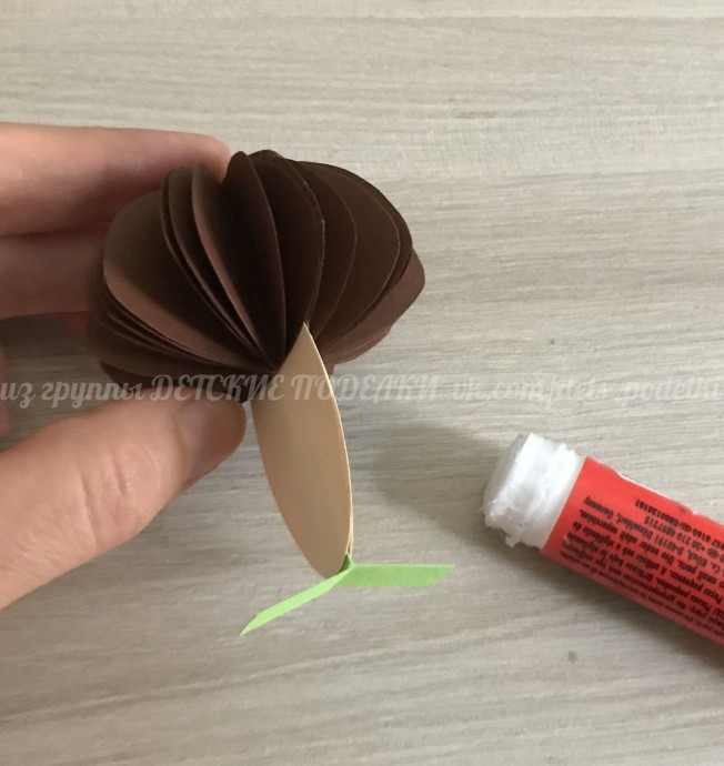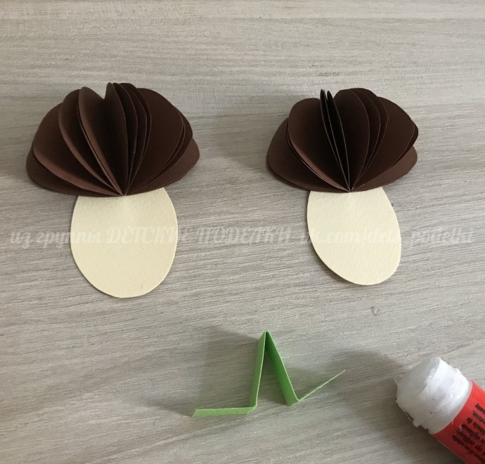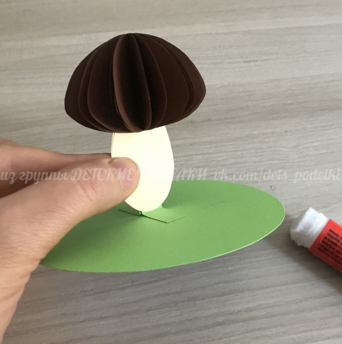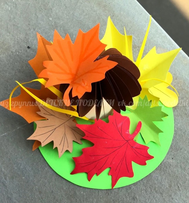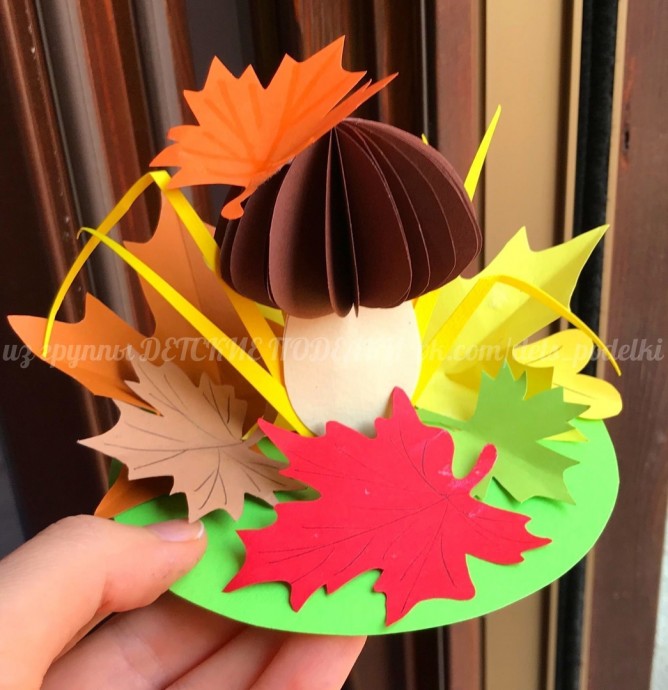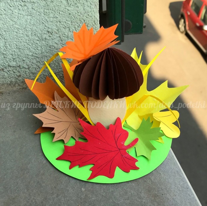 Объёмный гриб в траве дополнительно присыпан кленовыми листиками.