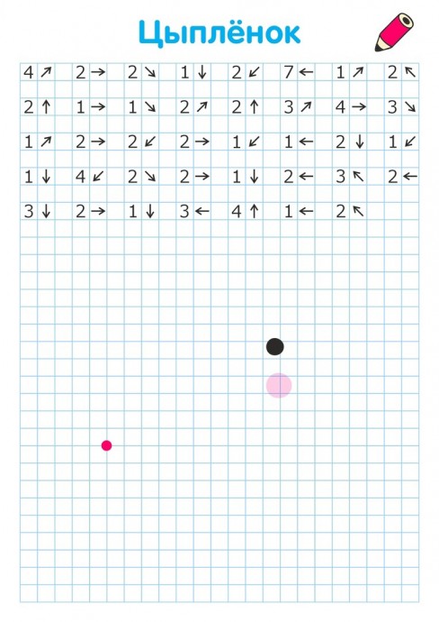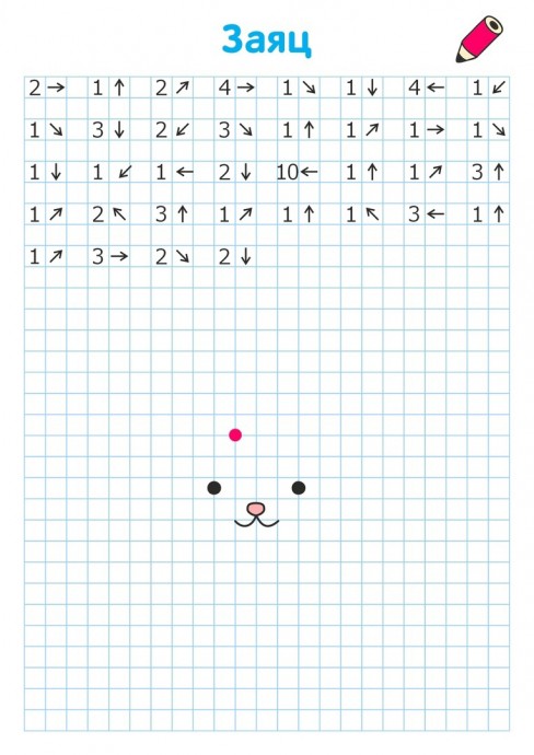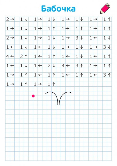 Цифра обозначает количество клеток, а стрелка — направление движения ручки. Начинать рисовать следует от красной точки. Готовые рисунки — на обложке.