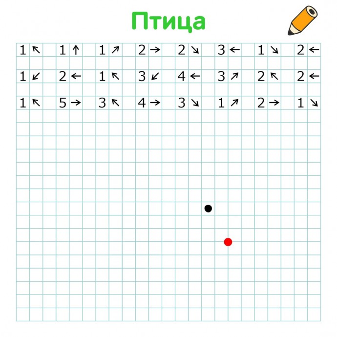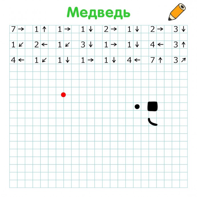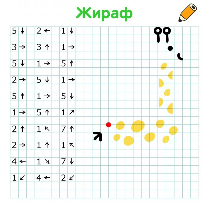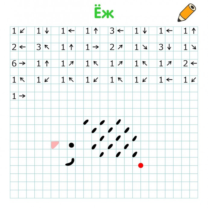 Распечатайте шаблоны и предложите ребёнку рисовать по клеточкам, как подсказывают цифры и стрелки. Цифра обозначает количество клеток, а стрелка — направление движения ручки. Начинать рисовать следует от красной точки. Готовые рисунки — на обложке. Графические диктанты помогают подготовить руку к письму, развивают графомоторику и внимательность, повышают интерес к учёбе.