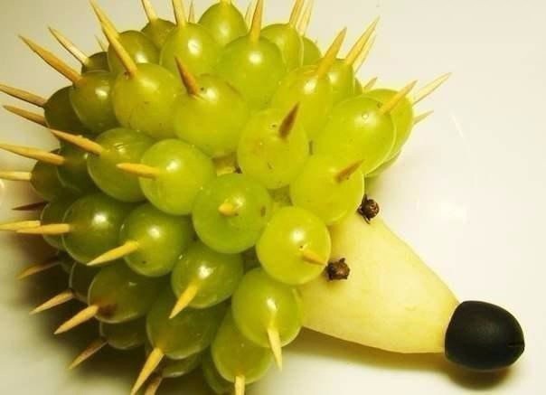 Ёжик из винограда и груши станет примером того, что найти материал для детских поделок можно повсеместно.
