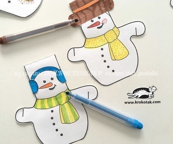 Верхняя часть снеговичков просто сгибается и цепляется за полоску бумаги или веревочку.